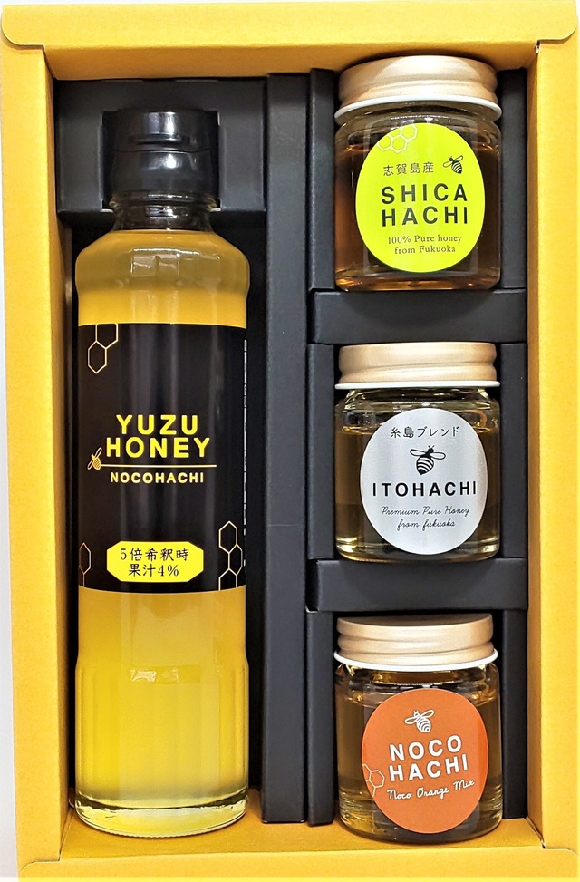 ユズとはちみつの希釈ドリンクと福岡産の純粋はちみつを詰め合わせたギフトセットです。非加熱・無添加のはちみつ三種を揃えたギフトセットはお中元、お歳暮や各種お祝い事などの贈り物におすすめです。 【原材料名】 ・純粋はちみつ ・精製はちみつ ・ユズ果汁 ・純粋はちみつ(福岡県能古島産) 【内容量】 ・「NOCOHACHI」レギュラー 80g ・「ITOHACHI」プレミアムブレンド 80g ・「SHICAHACHI」ブレンド 80g ・「NOCOHACHI」ユズハニー 【賞味期限】 純粋はちみつ:製造日よりニ年間 ユズハニー:製造日より八か月