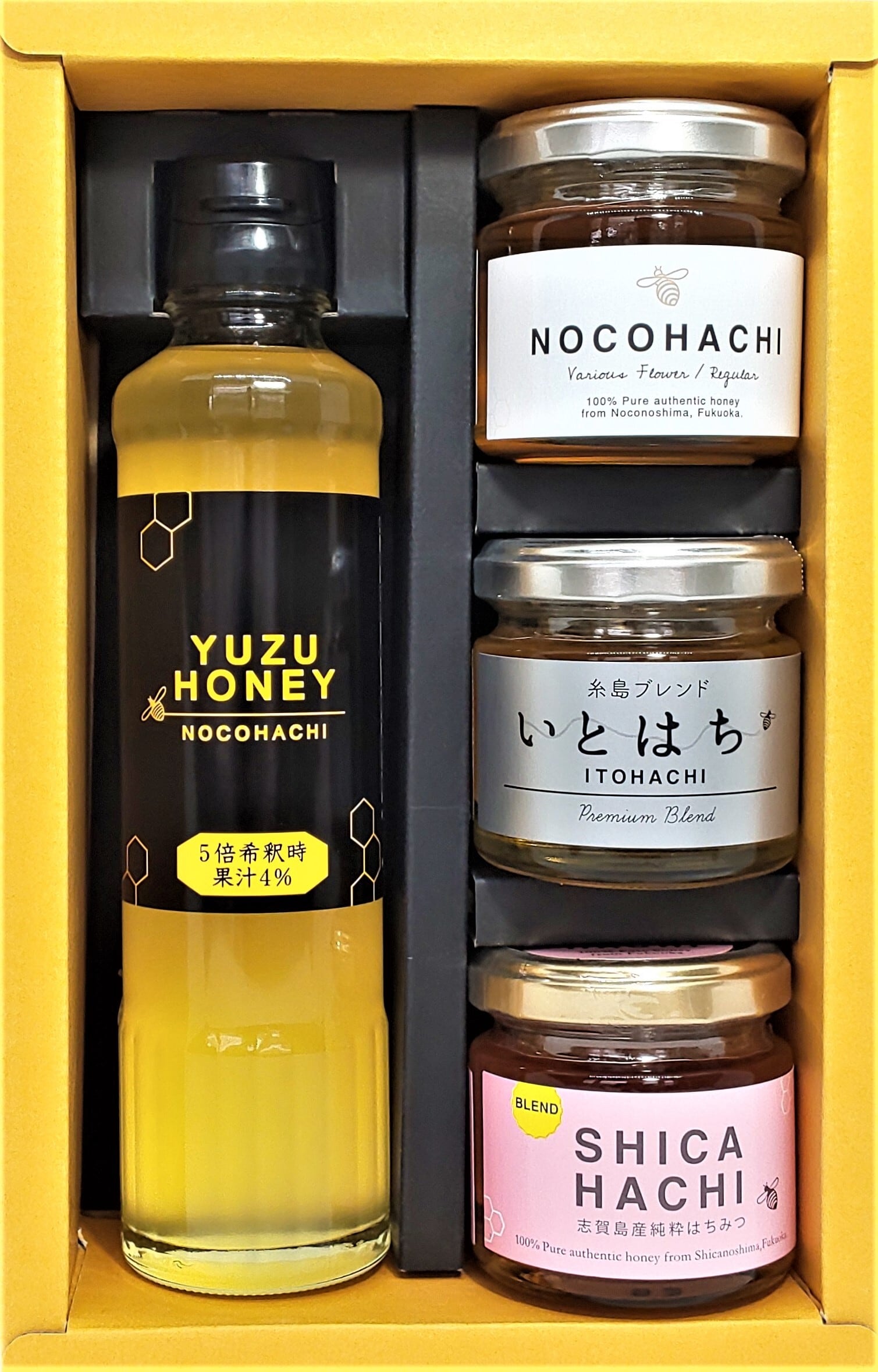 ユズとはちみつの希釈ドリンクと福岡産の純粋はちみつを詰め合わせたギフトセットです。非加熱・無添加のはちみつ三種を揃えたギフトセットはお中元、お歳暮や各種お祝い事などの贈り物におすすめです。